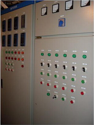 燃煤鍋爐控制柜 由原煤倉落下的原煤經給煤機送入磨煤機磨制成煤粉。在原煤磨制過程中,需要熱空氣對煤進行加熱和干燥,因此外界冷空氣通過送風機送入鍋爐尾部煙道的空氣預熱器中,被煙氣加熱成為熱空氣進入熱風管道。其中一部分熱空氣經排粉機送入磨煤機中,對煤進行加熱和干燥,同時這部分空氣也是輸送煤粉的介質;另一部分熱空氣直接經燃燒器進入爐膛參與煤粉的燃燒。從磨煤機排出的煤粉和空氣的混合物經燃燒器進入爐膛內燃燒。 煤粉在爐膛內迅速燃燒后放出大量的熱量,使爐膛火焰中心的溫度具有1500度或更高的溫度。爐膛四周內壁布置有許多的水冷壁管,爐膛頂部布置著頂棚過熱器及爐膛上方布置著屏式過熱器等受熱面。水冷壁和頂棚過熱器等是爐膛的輻射受熱面,其內部的工質在吸引爐膛的輻射熱的同時,使火焰溫度降低,保護爐墻不致被燒壞。為了防止熔化的灰渣黏結在煙道內的受熱面上,煙氣向上流動到達爐膛上部出口處時,其溫度要低于煤灰的熔點。 高溫煙氣經爐膛上部出口離開爐膛進入水平煙道,與布置在水平煙道的過熱器進行熱量交換,然后進入尾部煙道,并與再熱器、省煤器、和空氣預熱器等受熱面進行熱量交換,使煙氣不斷放出熱量而逐漸冷卻下來,使得離開空氣預熱器的煙氣溫度通常在110-160度之間。低溫煙氣再經過除塵器除去大量的飛灰,最后只有少量的細微灰粒隨煙氣由引風機送入煙囪排入大氣。 煤粉在爐膛中燃燒后所生成的較大灰粒沉降到爐膛底部的冷灰斗中,被冷卻凝固落入排渣裝置中,形成固定排渣。 燃煤鍋爐控制柜 一、功能概述