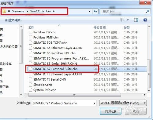 在彈出的“添加新的驅動程序”對話框中找到“SINMATIC S7 Protocol Suite.chn”文件,選中該文件,單擊“打開”,如下圖