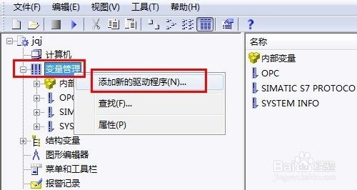首先在WinCC項目中添加通訊驅動程序。打開WinCC軟件,在項目管理器窗口中選中“變量管理”,單擊鼠標右鍵,在彈出的的菜單中選擇“添加新的驅動程序”
