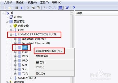 在變量管理目錄下新增一個“SINMATIC S7 Protocol Suite”子目錄,在其中找到“MPI”,單擊鼠標右鍵,在彈出的菜單中選擇“新驅動程序的連接”