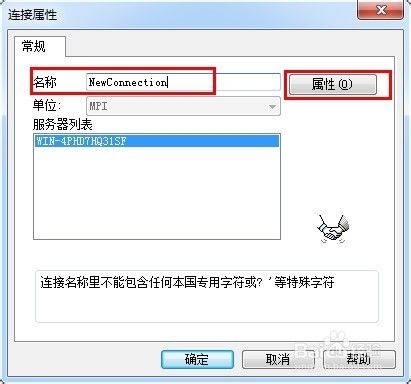 在彈出的“連接屬性”對話框中可以為新建的邏輯連接輸入一個名稱,單擊“屬性”按鈕會彈出“連接參數--MPI”對話框