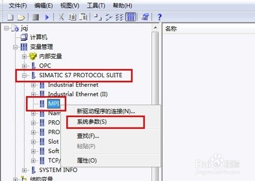 再在變量管理目錄下 “SINMATIC S7 Protocol Suite”子目錄中找到“MPI”,單擊鼠標右鍵,在彈出的菜單中選擇“系統參數”