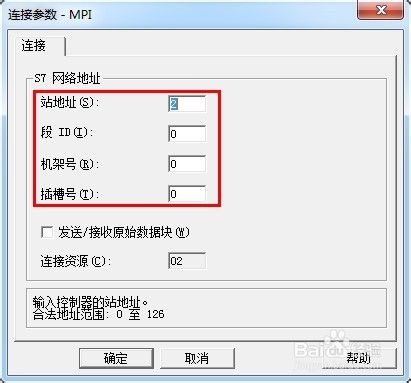 在“連接參數--MPI”對話框中可以輸入對應CPU的“站地址”、“段ID”、“機架號”和“插槽號”,如下圖,設置好后單擊確定按鈕